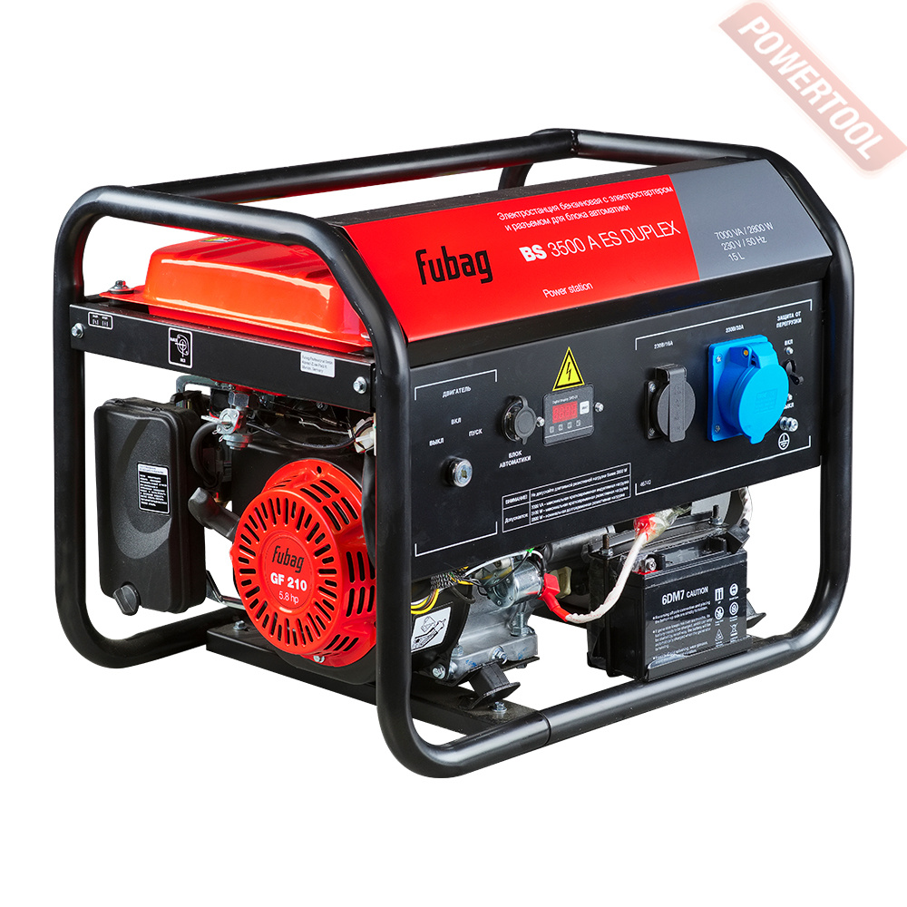 Бензиновый генератор однофазный 220 В, мощность 3,1 кВт, 4-тактный бензиновый двигатель ELITECH объемом 212 куб.см и мощностью 7 л.с. с электростартером, топливный бак 15 л, расход топлива 1,5 л/ч, объем картера 0,6 л, 2 розетки 220В/16A, выход 12 В, автоматический стабилизатор AVR, защита от перегрузки, вольтметр, датчик топлива, счетчик моточасов, резиновые стойки для снижения вибрации, размеры 605x490x495 мм, вес 54 кг, аккумуляторная батарея, набор инструментов.