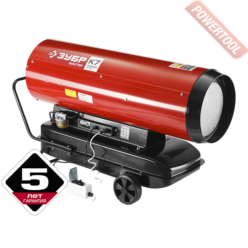 • Тепловая пушка снабжена встроенным термостатом. Термостат автоматически поддерживает заданную температуру воздуха в помещении, автоматически отключая и включая тепловую пушку. Есть цифровая индикация температуры и ошибок.