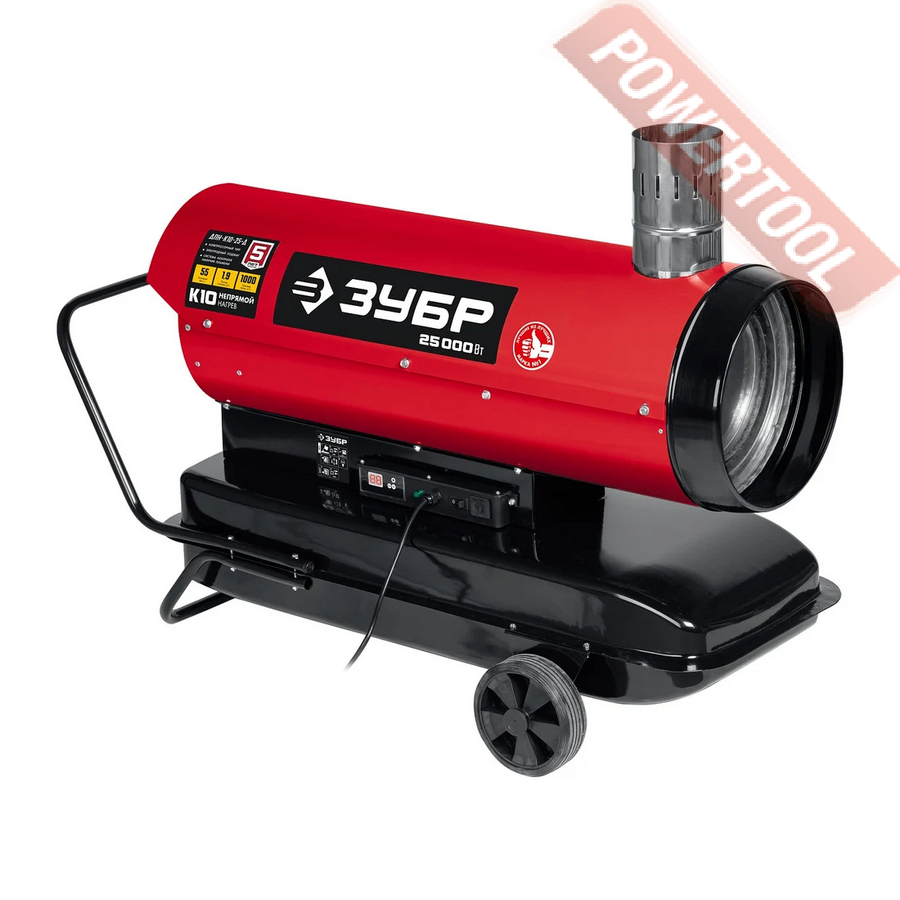 Дизельная тепловая пушка непрямого нагрева, напряжение сети 220 В, тепловая мощность 25 кВт, расход воздуха 329 куб.м/ч, расход топлива 1,8 л/ч, объем топливного бака 50 л, потребляемая мощность 280 Вт, встроенный термостат, контроль пламени, датчик перегрева, датчик уровня топлива, дымоход, время автономной работы до 27 ч, габариты ДхШхВ 1050х440х550 мм, вес 39 кг, тележечный комплект.