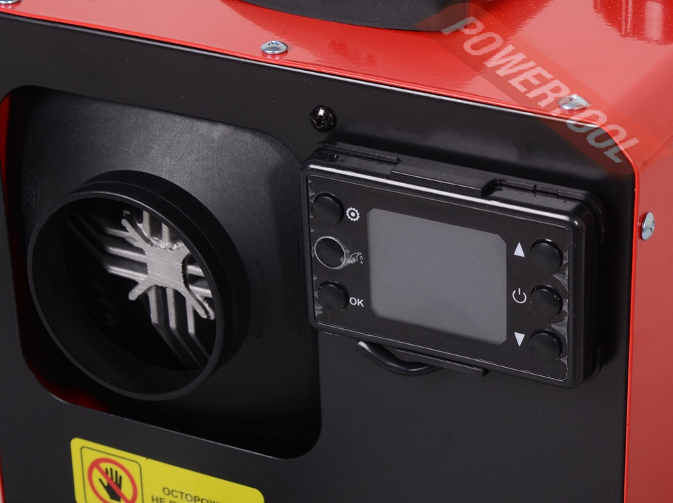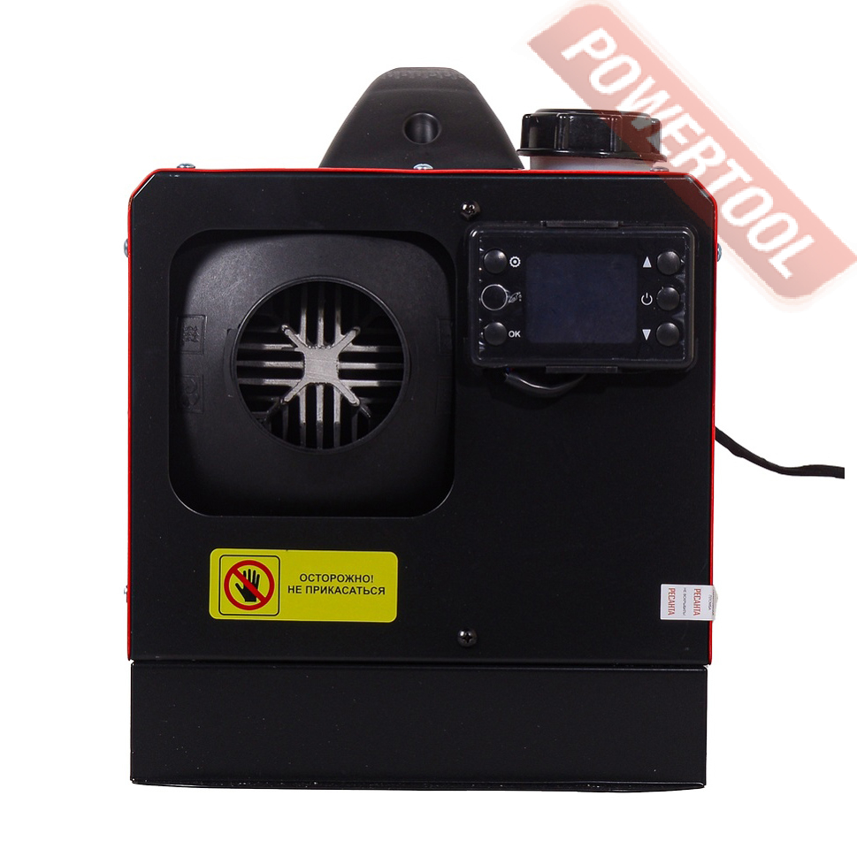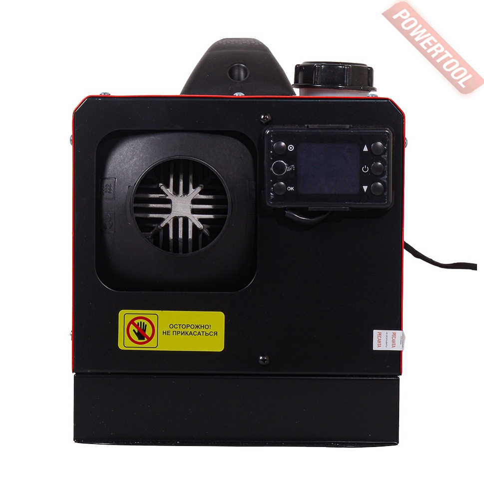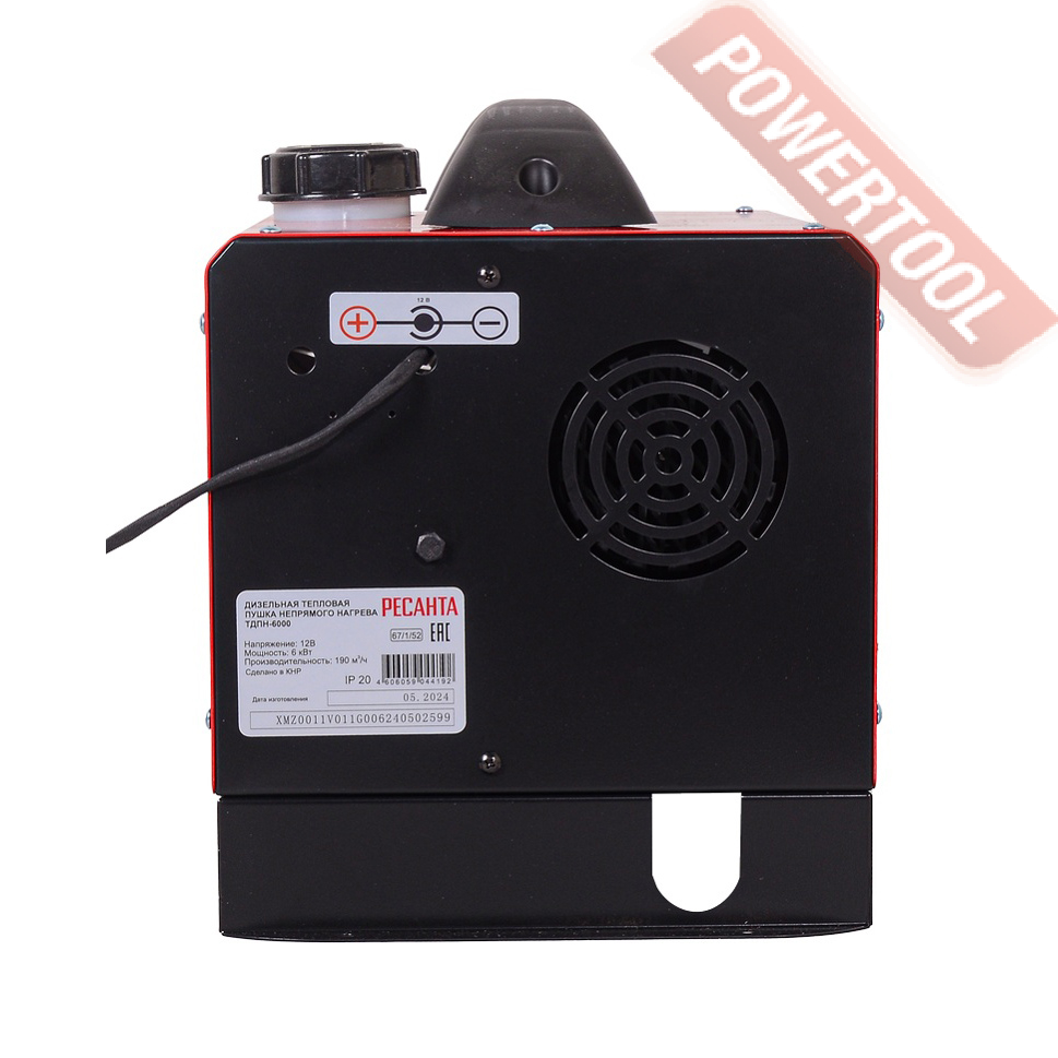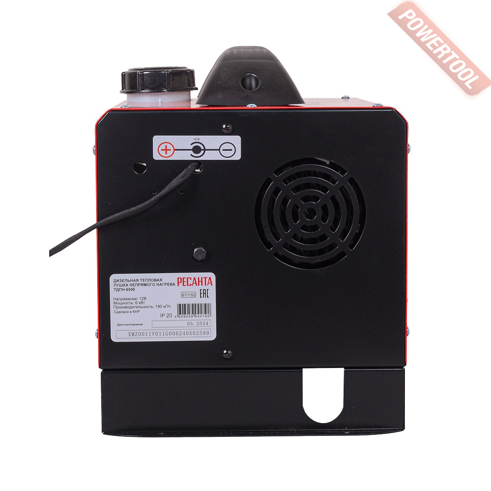 Дизельная тепловая пушка непрямого нагрева, напряжение сети 12 В, тепловая мощность 6 кВт, расход воздуха 190 куб.м/ч, расход топлива 0,31 кг/ч, объем топливного бака 5 л, встроенный термостат, контроль пламени, датчик перегрева, датчик уровня топлива, дымоход, время автономной работы до 16 ч, вес 9,8 кг, провод 12В, пульт ДУ.