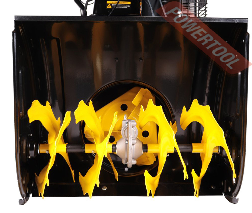 - Мощный металлический зубчатый шнек. Стальные зубцы шнека специальной заострённой формы вгрызаются в самые плотные снежные пласты и ледяную корку, гарантируя мгновенное измельчение и бесперебойную подачу снега на крыльчатку для мощного выброса снега.