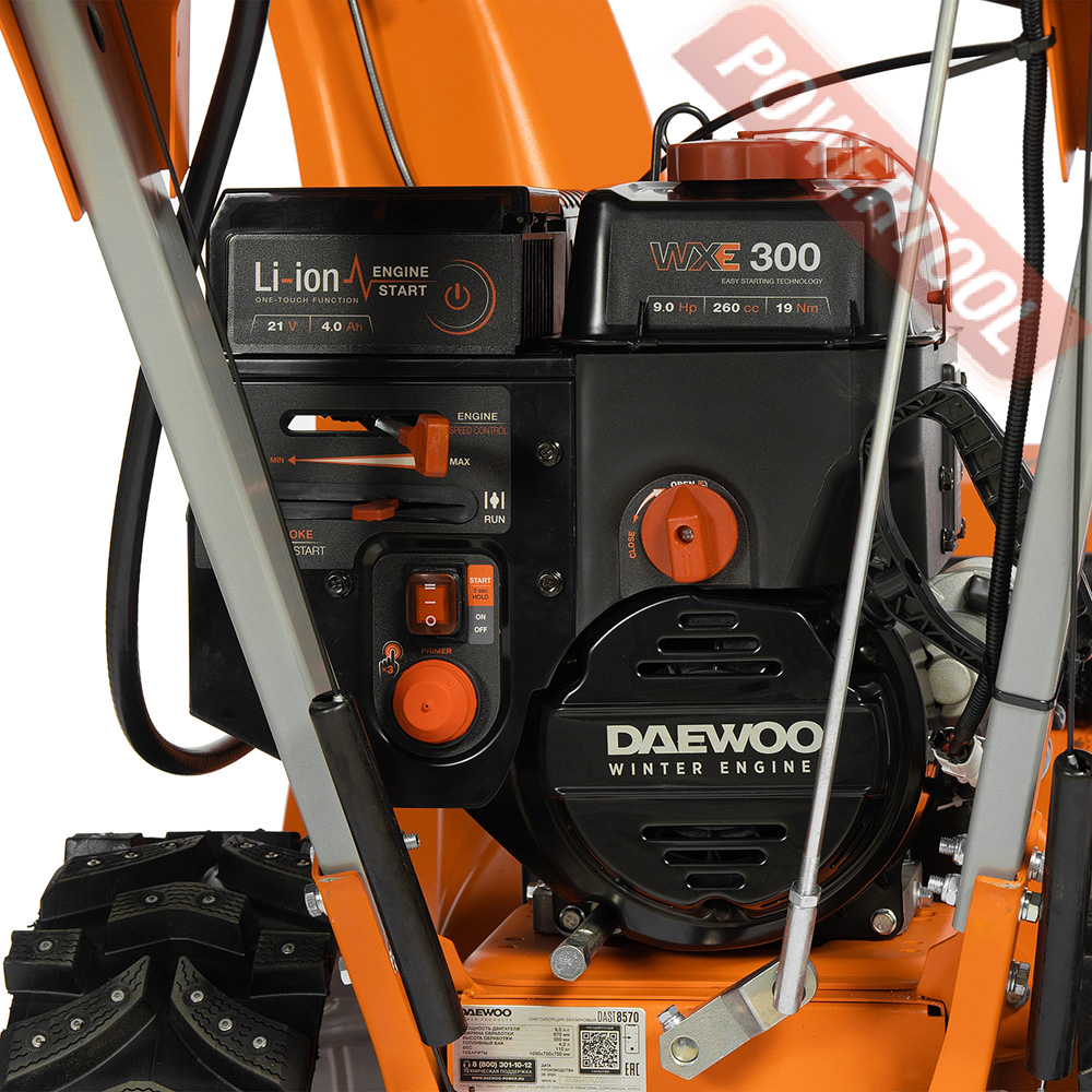 Снегоуборщик колесный самоходный, ширина ковша 67 см, высота ковша 55 см, скорости 5 вперед и 2 назад, выбор направления и дальности выброса снега рукоятками с панели оператора, угол поворота желоба 180 градусов, дальность выброса достигает до 15 м, материал желоба сталь, управление одной рукой, подогрев рукояток, двухсоставные направляющие лыжи, LED фара, защита от ржавчины ZN+, колеса EX-ICE 150/25-R8, 4-тактный бензиновый двигатель DAEWOO WXE 300 объемом 260 куб.см и мощностью 9 л.с., электростартер от аккумулятора 21 В, т опливный бак 4,2 л, объем картера 0,6 л, размеры упаковки 1050х750х750 мм, вес 110 кг, АКБ и ЗУ.