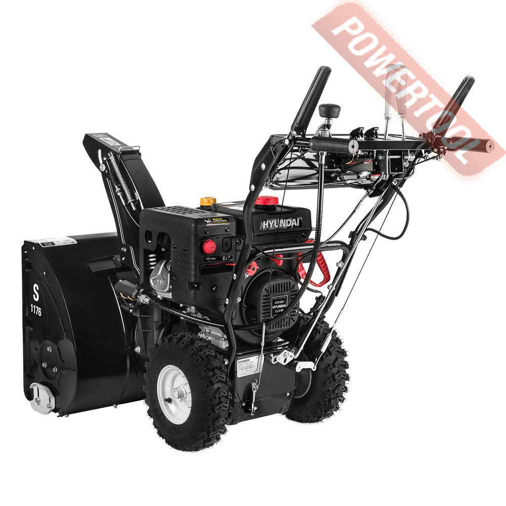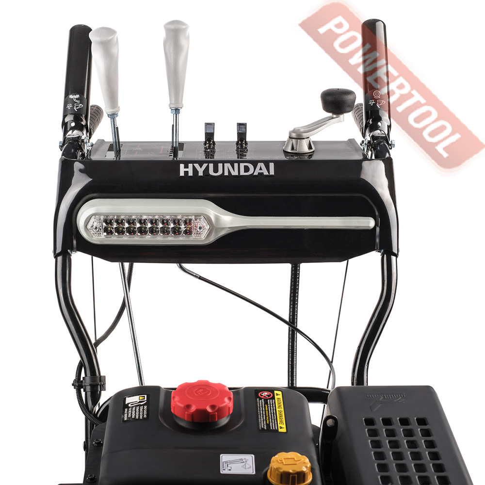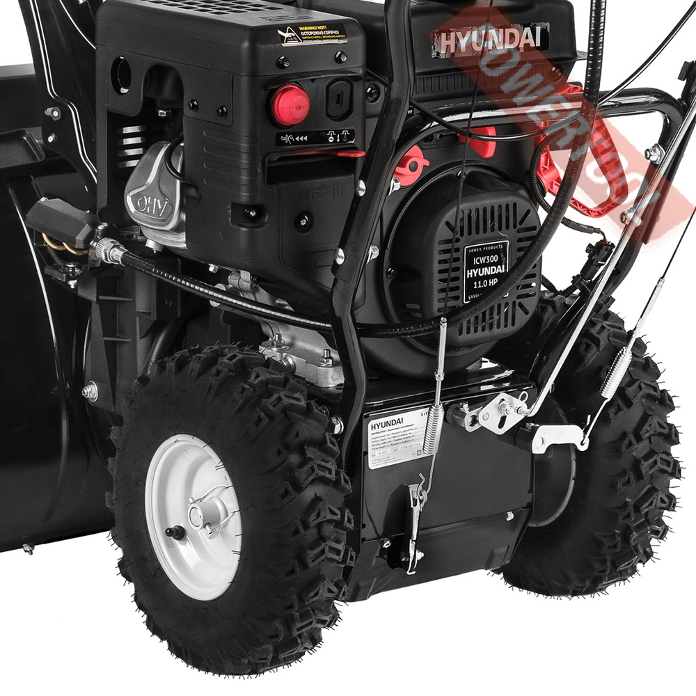 Снегоуборщик колесный самоходный, ширина ковша 76 см, высота ковша 51 см, скорости 5 вперед и 2 назад, выбор направления и дальности выброса снега рукоятками с панели оператора, дальность выброса достигает до 11 м, подогрев рукояток, LED фара, шины Х-ТRACK, 4-тактный бензиновый двигатель HYUNDAUI ICW360 объемом 358 куб.см и мощностью 11 л.с., электростартер от сети 220 В, топливный бак 4 л, объем картера 1,1 л, трансмиссия фрикционный диск, вес 100 кг.