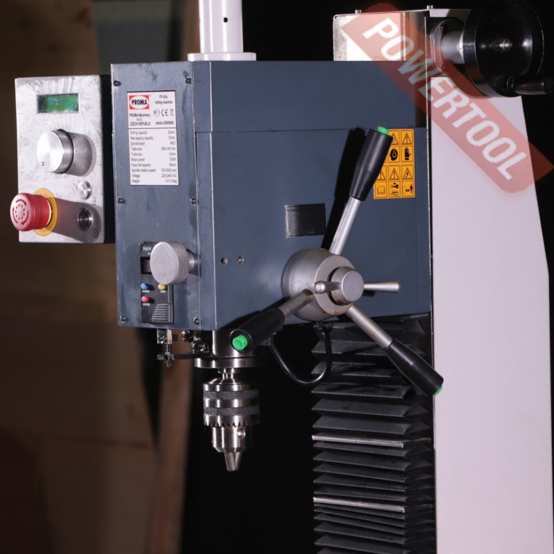 Сверлильно фрезерный станок по металлу PROMA FP-20A представляет собой компактную конструкцию для обрабатывания небольших деталей. Среди возможностей агрегата - концевое и торцевое фрезерование, сверление отверстий диаметром до 20 мм, нарезание резьбы размером до М12. Питание станка осуществляется от однофазной сети. Для визуального контроля параметров работы на пульте управления есть цифровой дисплей. Крупные рукояти способствуют удобству эксплуатации оборудования. Для точности в работе на край стола нанесена миллиметровая разметка.