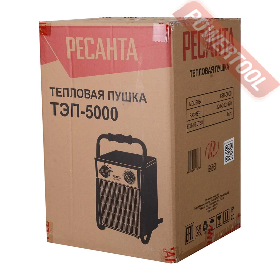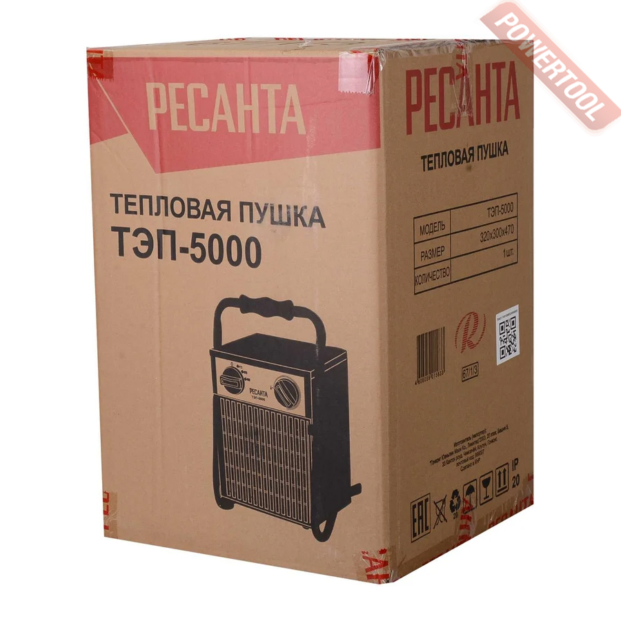 Тепловая пушка электрическая РЕСАНТА ТЭП-5000 - надежный экономичный обогреватель для квартиры и загородного дома. Большая площадь ТЭНов из нержавеющей стали и эффективный обдув способствуют более быстрому нагреву помещения без выжигания кислорода. Безопасность обеспечена дополнительным защитным кожухом, термопредохранителем, капиллярным терморегулятором и заземлением корпуса. Это устройство позволяет создать приемлемые климатические условия в помещениях даже с полным отсутствием иных источников отопления. Конструкция надежна и практична. Запуск производится путем переключения регулировочного реле. Обеспечивает чистый, быстрый и безопасный нагрев, идеален в качестве временного или экстренного средства обогрева благодаря простоте эксплуатации и мобильности. Процесс эксплуатации можно охарактеризовать достаточно тихим, при этом отсутствуют какие либо запахи. Нет необходимости заправлять оборудование топливом, достаточно просто произвести подсоединение к сети. Также однозначным достоинством технологии является сбережение кислорода внутри помещения.