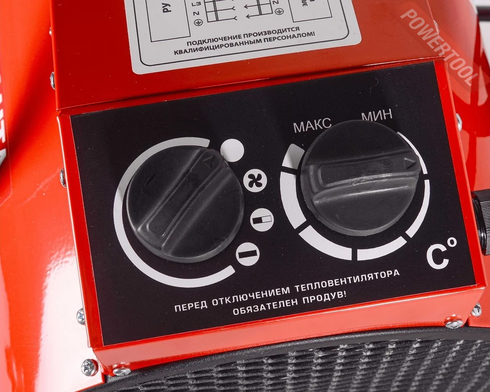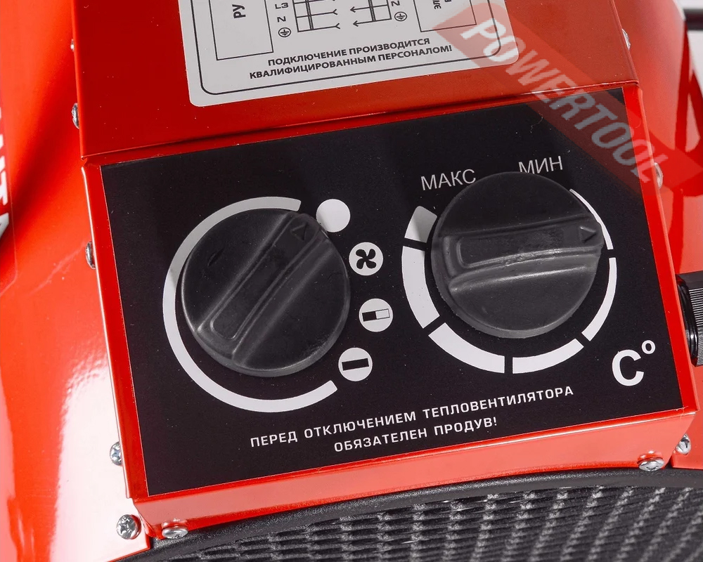 - Три режима работы. Работа в режиме вентилятора без обогрева. Работа в режиме максимальной мощности с обогревом. Работа в режиме частичной мощности с обогревом. Чтобы выключить устройство, следует перевести регулятор температуры на минимум и установить переключатель в положение "О". Для продления срока службы ТЭНов рекомендуем перед выключением изделия предварительно охлаждать его, переключив его на режим вентилятора и дав поработать не менее минуты перед полным выключением.